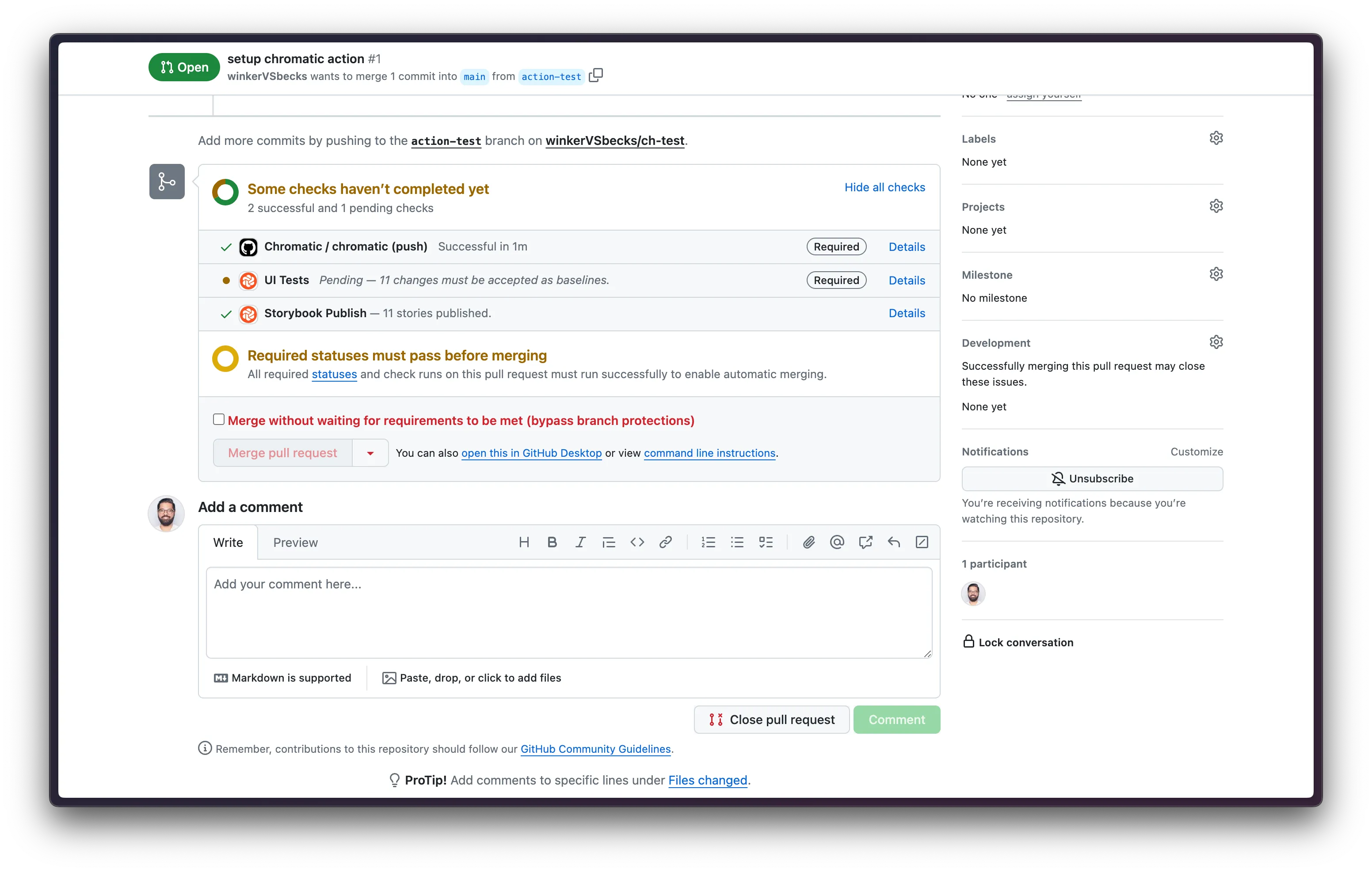 - Now all pull requests to the protected branch will require the Chromatic checks to pass before merging.